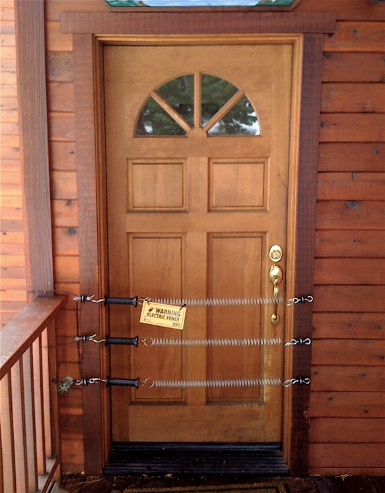 Spring gates on the front door. Usually leave these disconnected when at home.